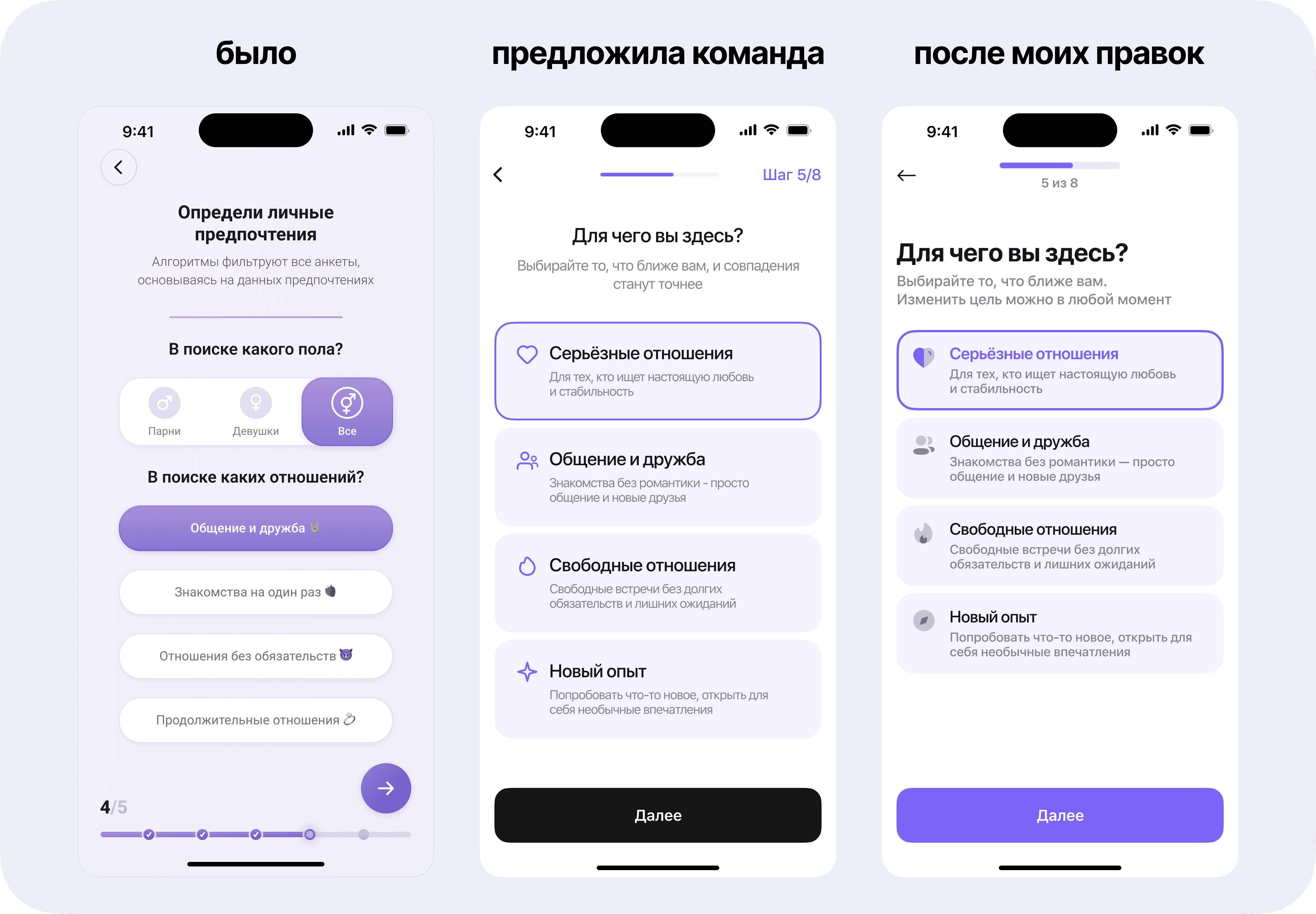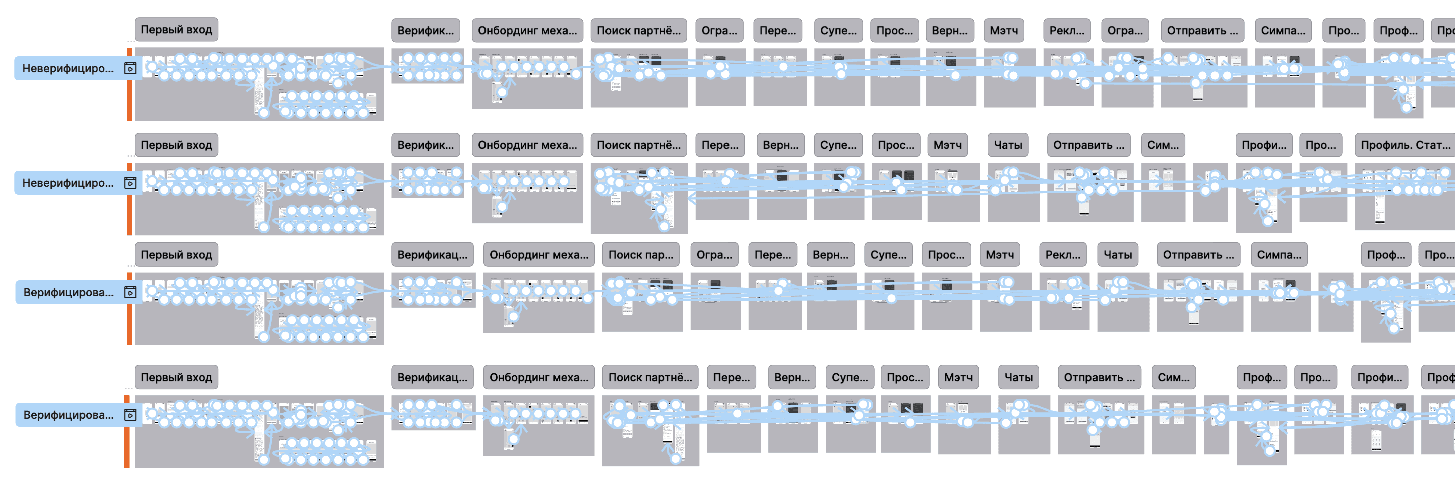 В начале работы вместе с фаундером мы зафиксировали все важные метрики, чтобы при выходе в прод оценить успешность нашей работы. По запросу заказчика, а также для полного погружения в сферу дейтинга, мы провели ряд исследований и аналитики. Часть материалов вы можете посмотреть в Figma-файле.
