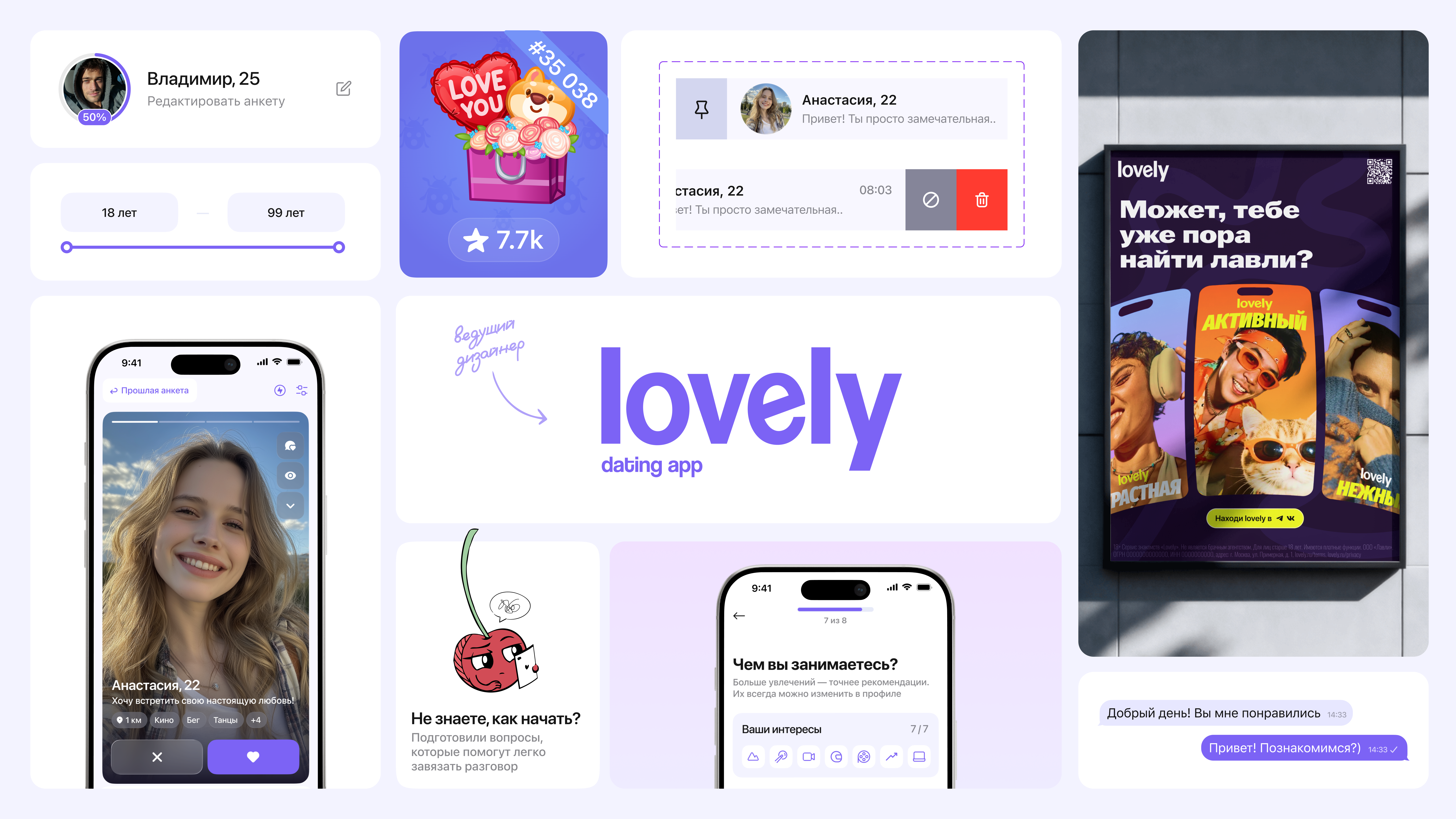 Lovely — приложение для знакомств с ощутимой по объёму аудиторией. Продукт обратился за полным редизайном (интерфейс, айдентика) в момент, когда сервис начал стремительно набирать обороты и расти ежедневно. Для такого амбициозного проекта потребовалась небольшая команда продуктовых и графических дизайнеров.
